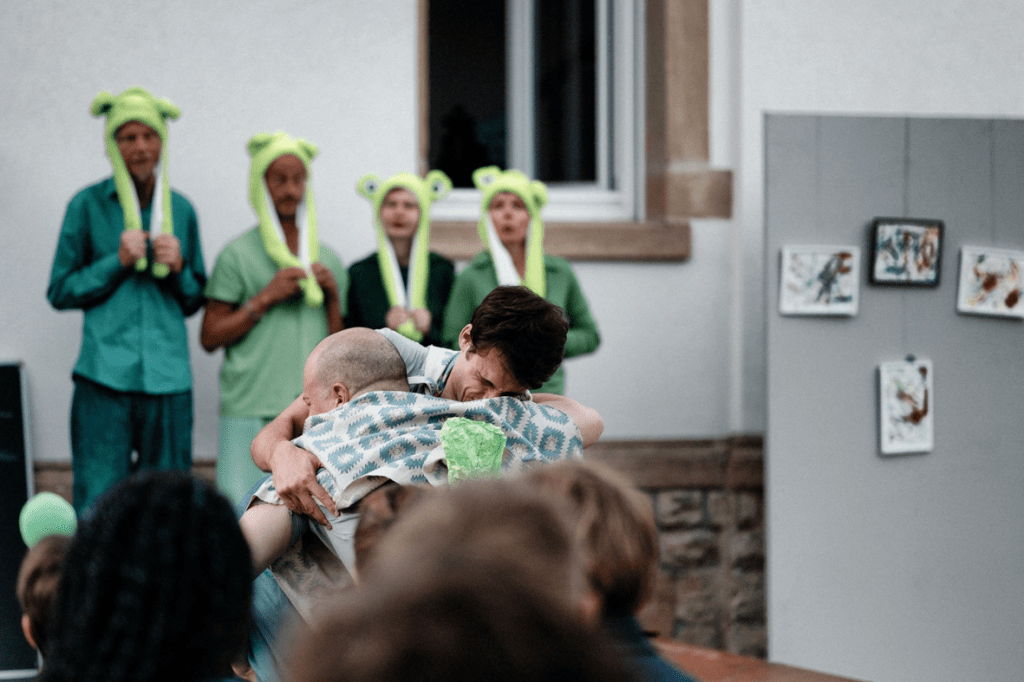 The theatre performance was a freely inspired adaptation of The Frogs by Aristophanes, blending classical themes with modern interpretations and improvised parts, reimagining its ancient narrative with a fresh, contemporary twist.